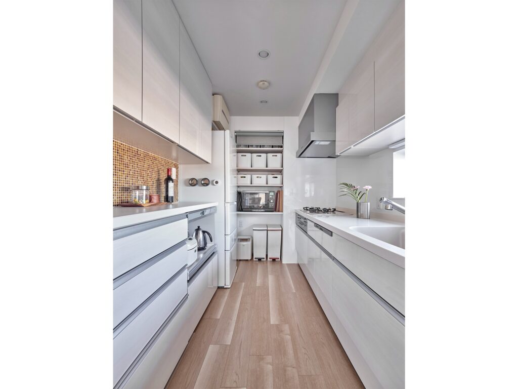 キッチンのインテリアは白で統一して、すっきりした印象に仕上げています。突き当たりのスペースを食品収納庫とゴミ箱置き場にすることで、空間を有効活用しているのが特徴です。背面は食器棚を配置して、調理家電や食器が効率的に収められています。