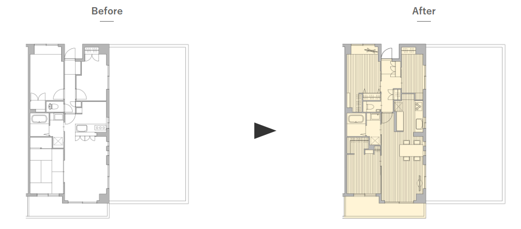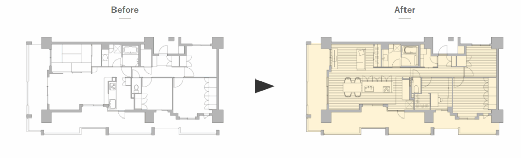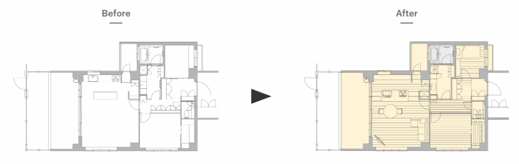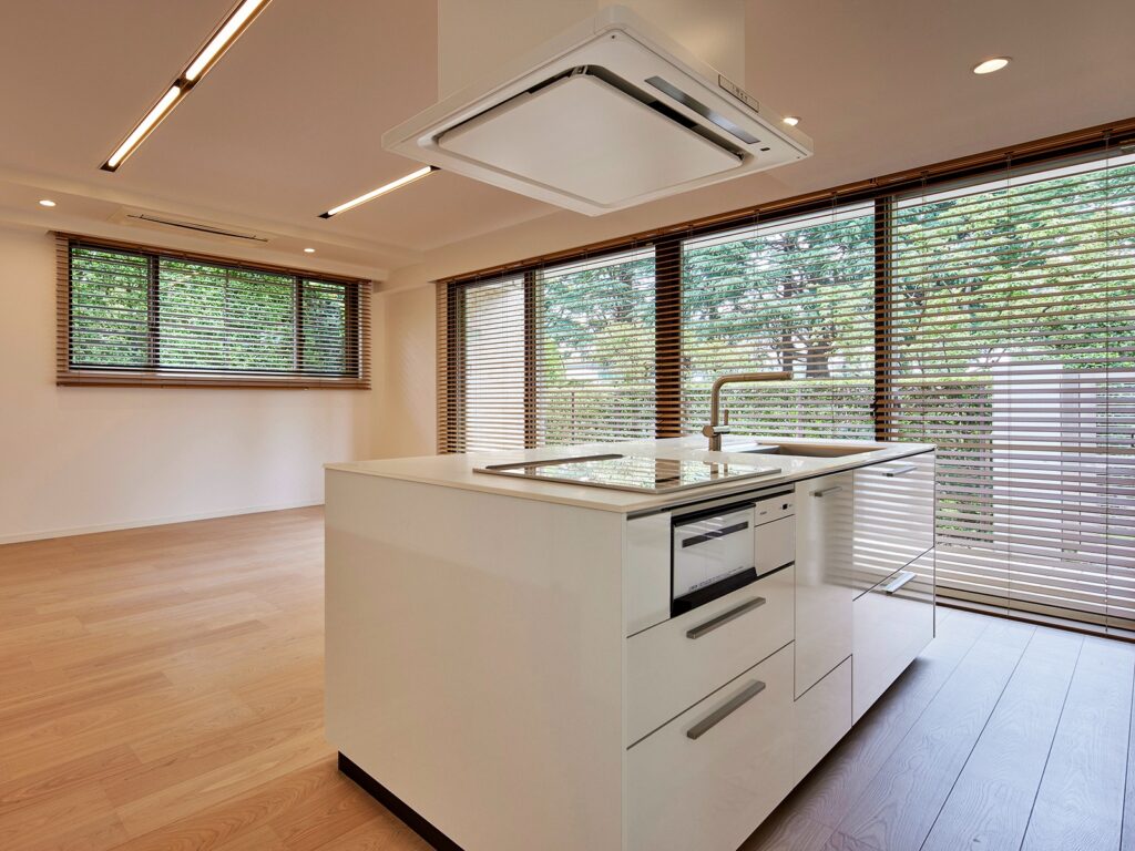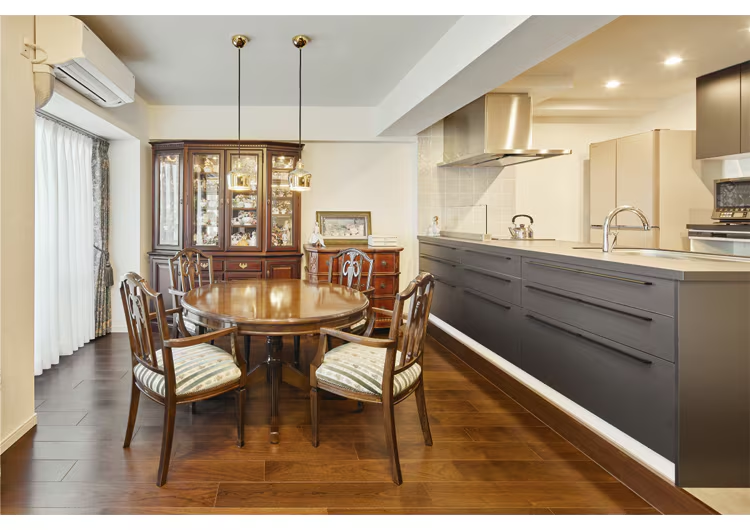 こちらは元々対面のペニンシュラ型キッチンでしたが、あえて壁付のセミオープンキッチンにリフォームしています。これにより収納スペースの確保や、ダイニングスペースの拡張が実現しています。